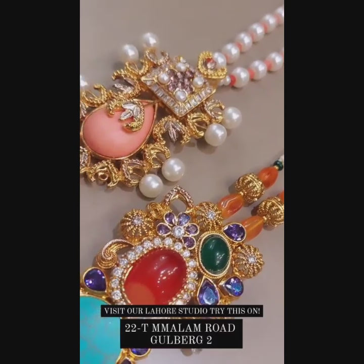 Handcrafted 22 k gold plated pendant mala studded with zircon,pearl,falsa and pink stone.