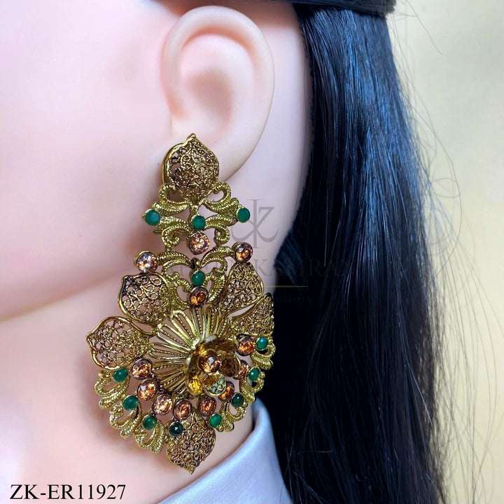 Handcrafted 22k gold plated earrings studded with coffee stones and emerald.