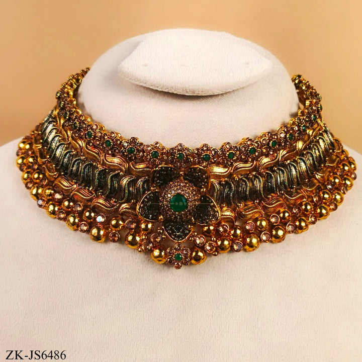 Handcrafted 22k gold plated necklace alongside earrings studded with emerald and polki.