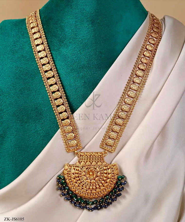 Handcrafted 22k gold plated mala alongside earrings and tikka studded with sapphire and emerald.