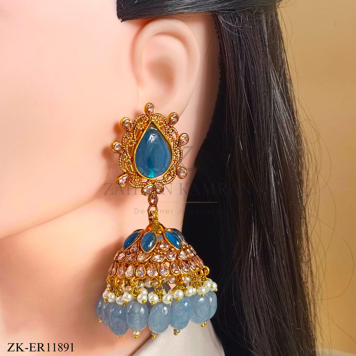 Handcrafted 22k gold plated earrings studded with aqua and coffee stones.