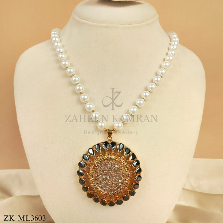 Handcrafted 22k gold plated calligraphy mala adorned with black onyx and pearls.