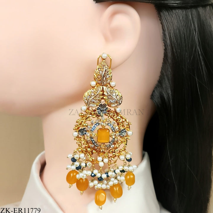 Handcrafted 22k gold plated earrings studded with citrine, sapphire, zircons and pearls.