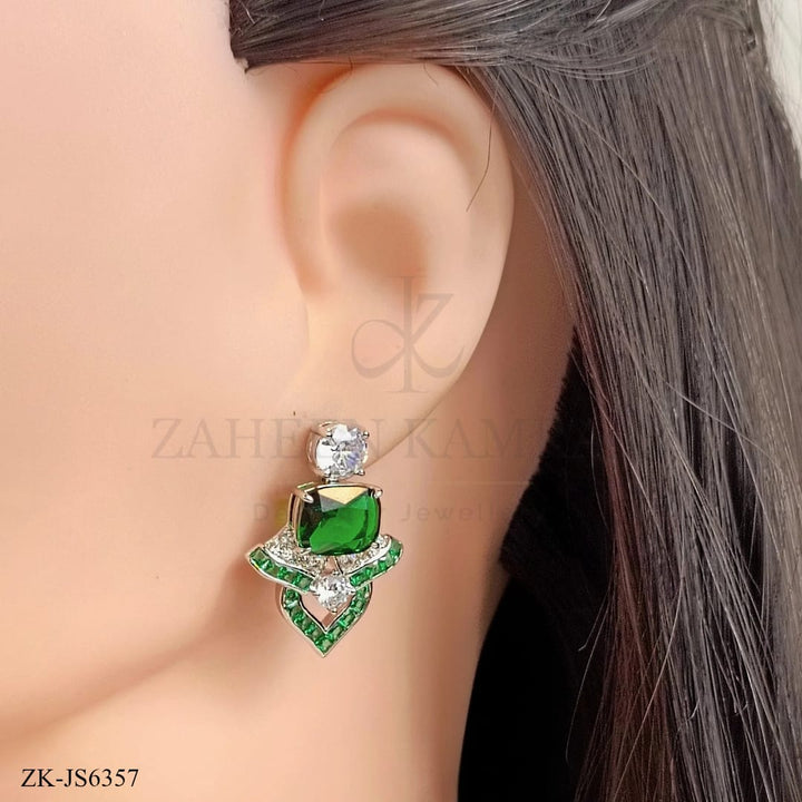Handcrafted silver plated choker alongside earrings studded with emerald and zircons.