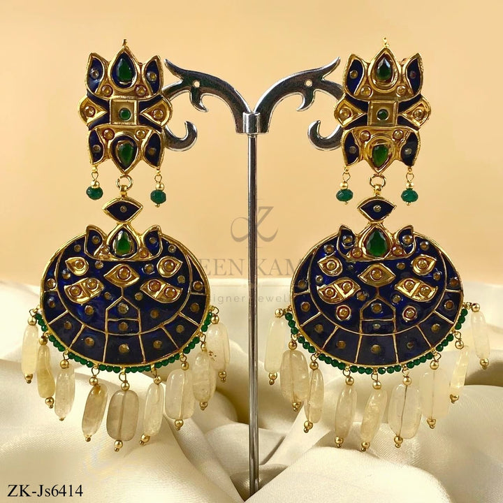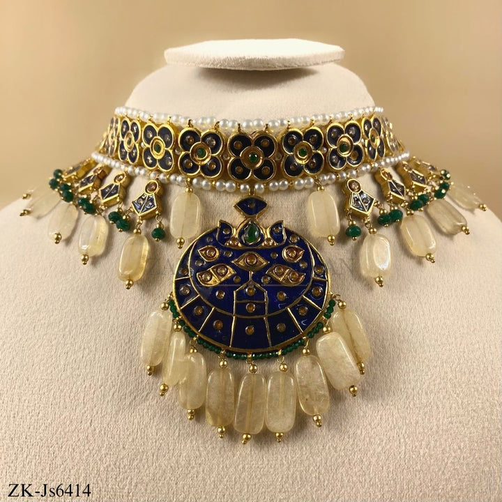Handcrafted 22k gold plated choker alongside earrings and tikka studded with emerald and blue meena.