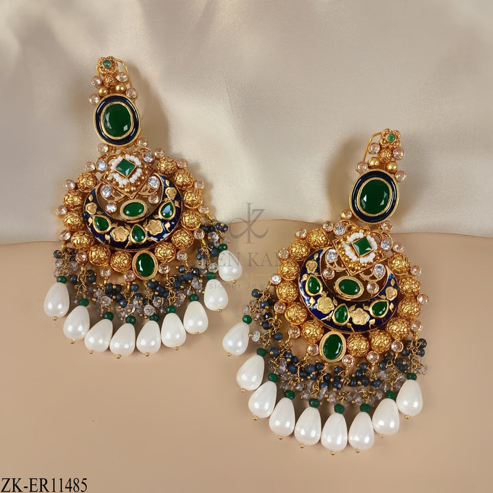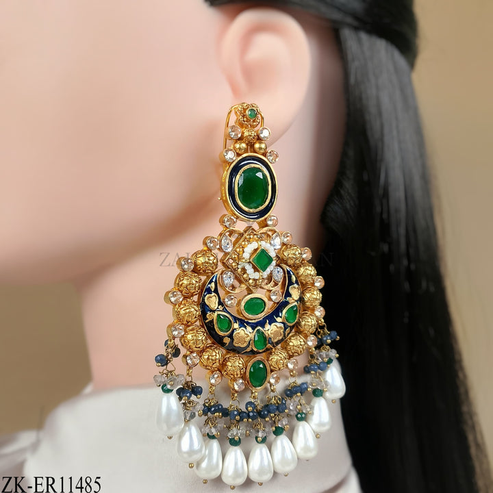 Handcrafted 22k gold plated earrings adorned with emerald, sapphire, pearls and blue meena.