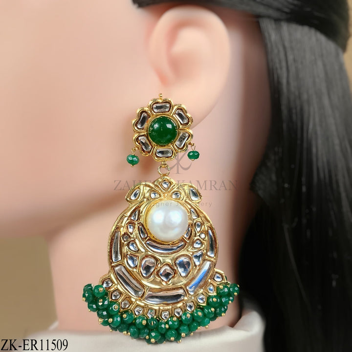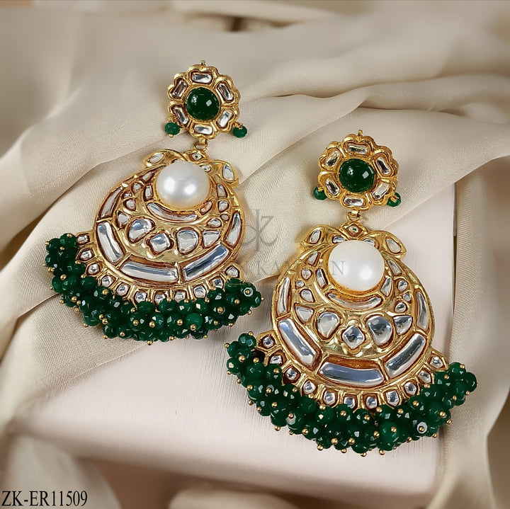 Handcrafted 22k gold plated earrings adorned with kundan, emerald and pearl.