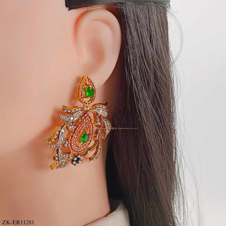 Handcrafted 22k gold plated earrings studded with ruby, emerald and zircons.