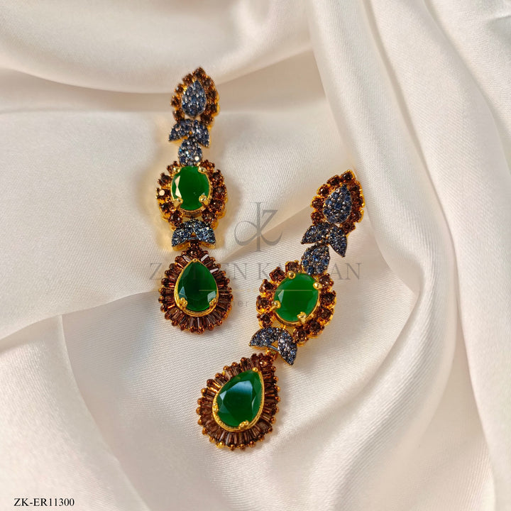 Handcrafted 22k gold plated earrings studded with emerald, smoky and coffee stones.