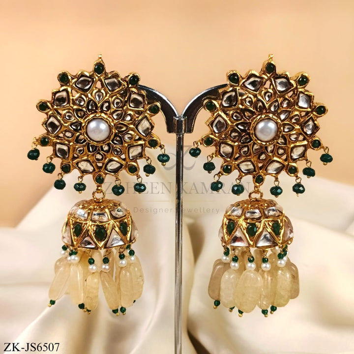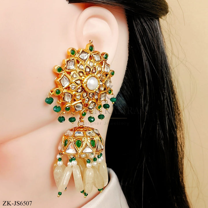 Handcrafted 22k gold plated choker alongside earrings studded with emerald, kundan and pearls.