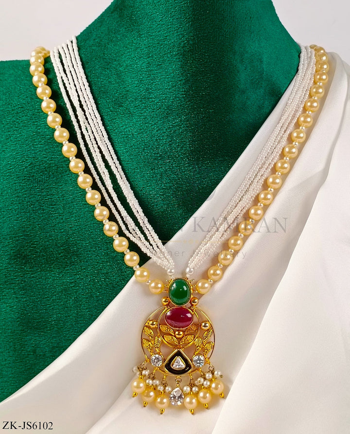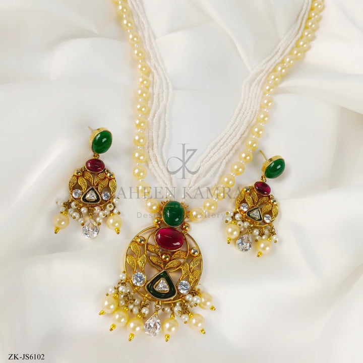 Handcrafted 22k gold plated mala alongside earrings studded with emerald, ruby and off white pearls.