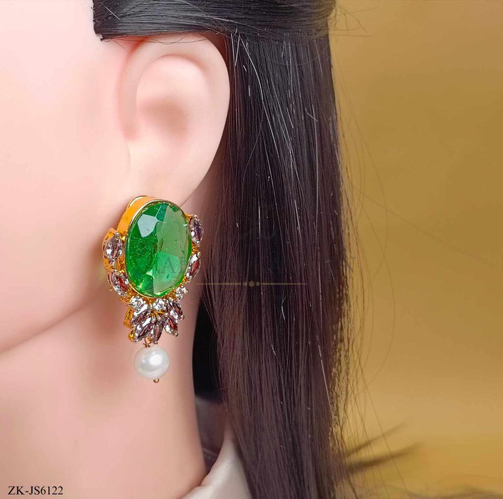 Handcrafted 22k gold plated mala alongside earrings studded with emerald, smoky stones and pearls.
