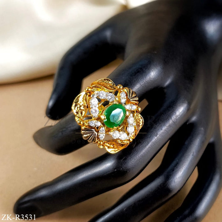 Handcrafted 22k gold plated ring studded with emerald and zircons.