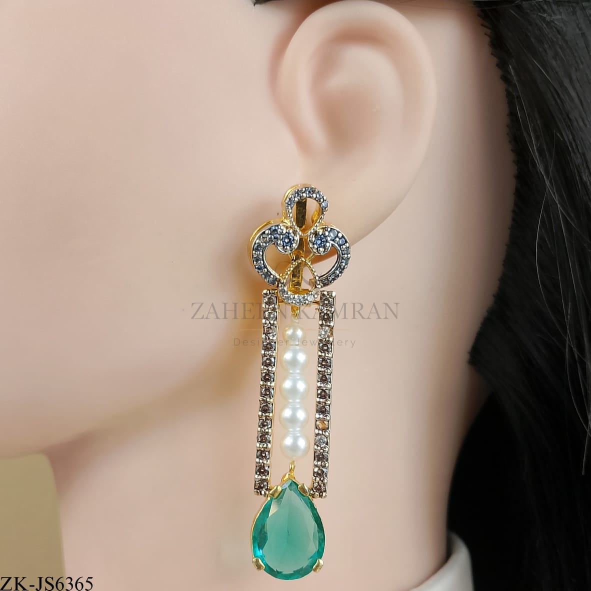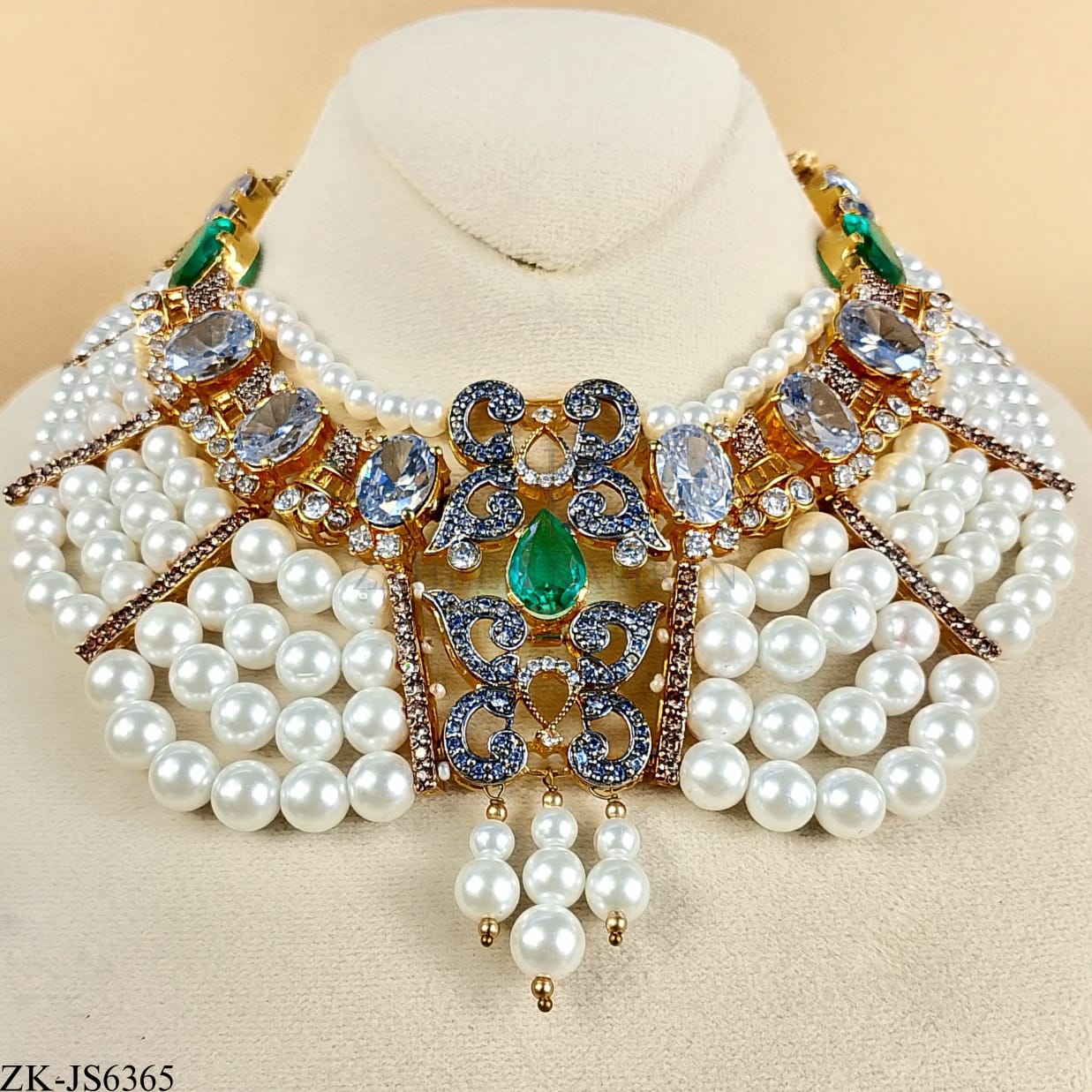 Handcrafted 22k gold plated necklace alongside earrings studded with emerald, smoky stones, zircons and pearls.