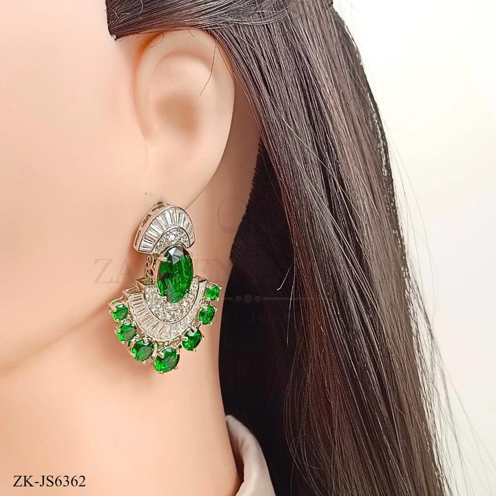Handcrafted silver plated necklace alongside earrings, ring and bracelet studded with emerald, zircons and cut stones.