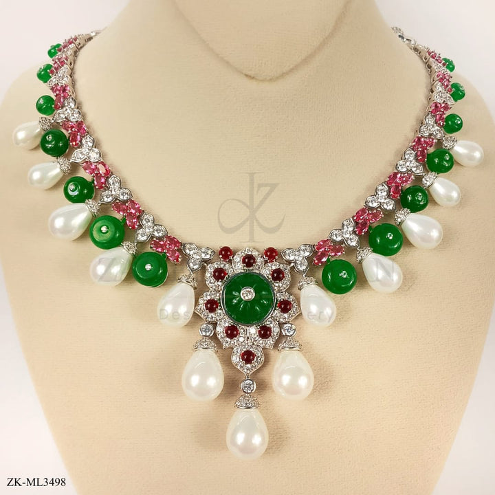 Handcrafted silver plated mala studded with emerald, pink zirconia, pearls and zircons.