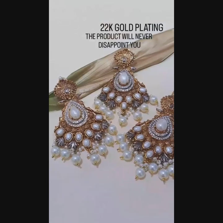 Handcrafted 22k gold plated necklace along with earrings adorned with white opals, pearls and zircons.