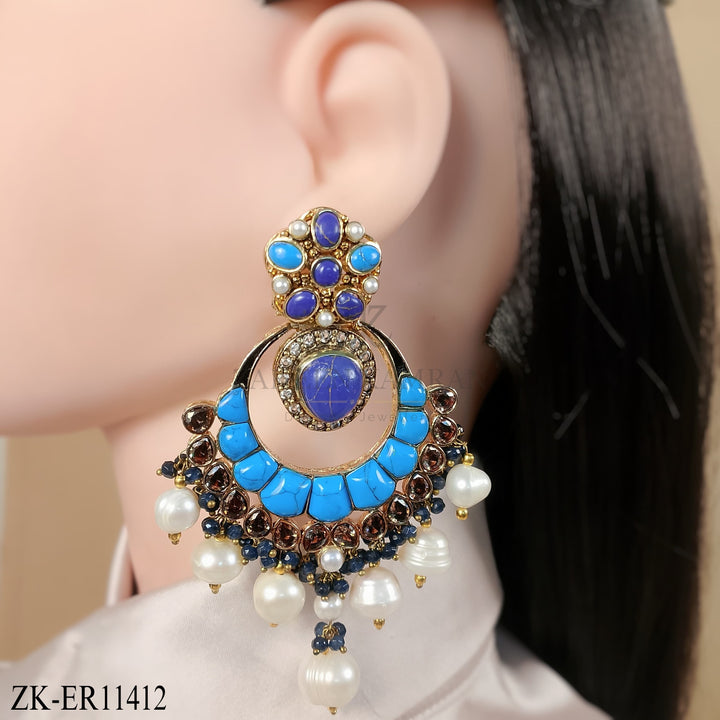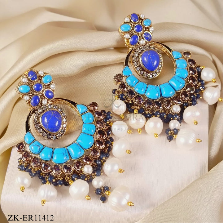 Handcrafted 22k gold plated earrings studded with feroza, sapphire and coffee stones.