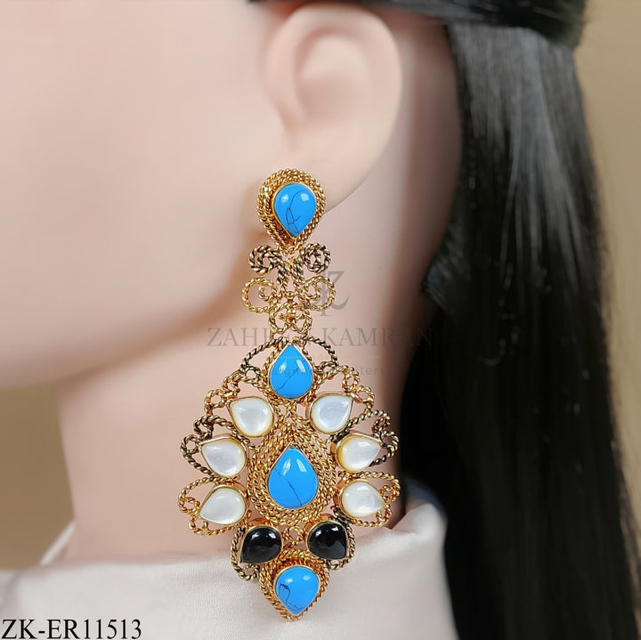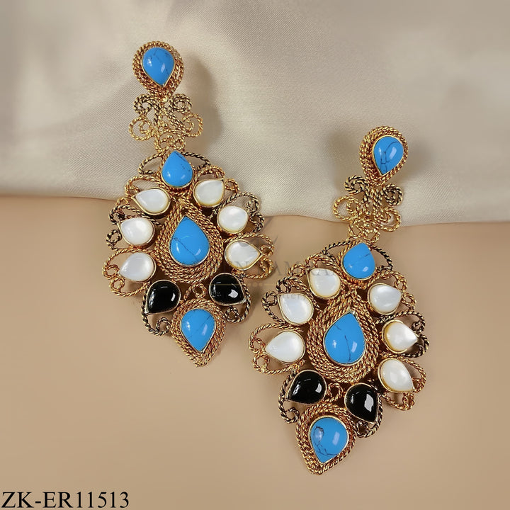 Handcrafted 22k gold plated earrings adorned with feroza, white opals and black onyx.