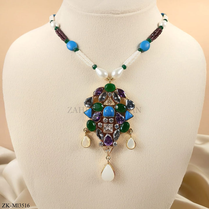 Handcrafted 22k gold plated mala studded with feroza, emerald, amethyst, smoky stones and pearls.