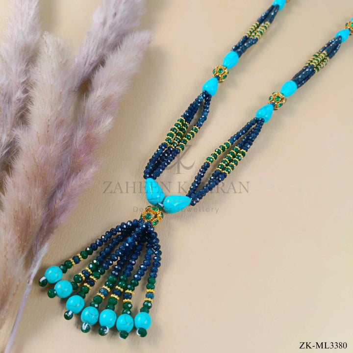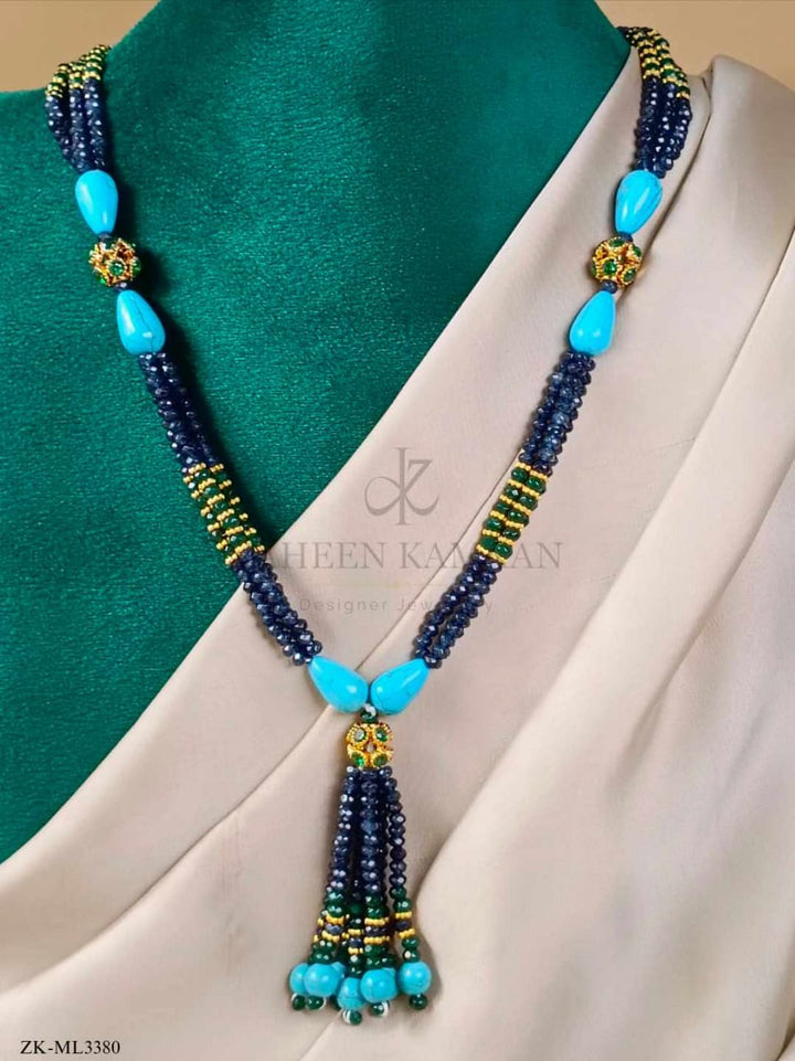 Handcrafted 22k gold plated mala studded with feroza, emerald and sapphire.