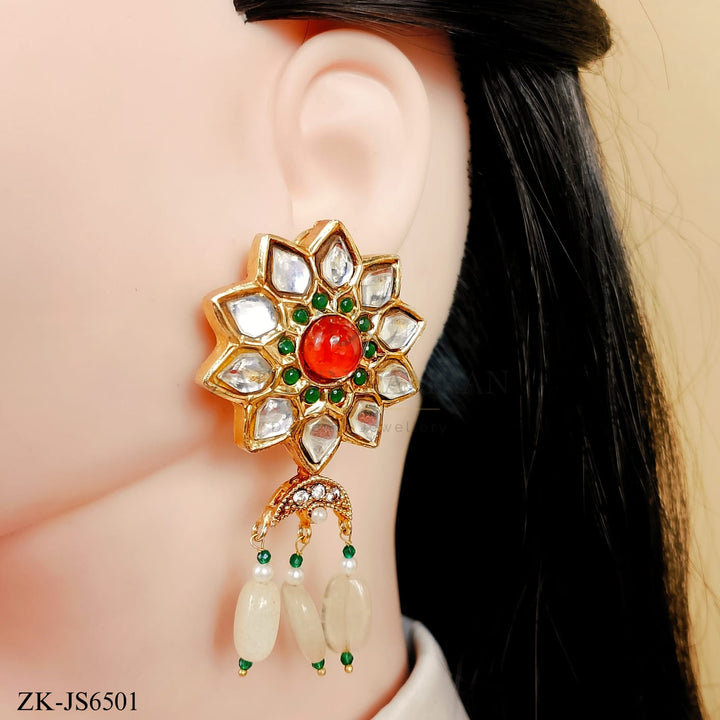 Handcrafted 22k gold plated choker alongside earrings studded with emerald, pink zirconia, kundan and pearls.