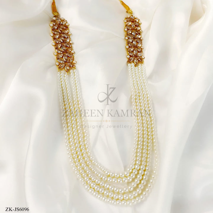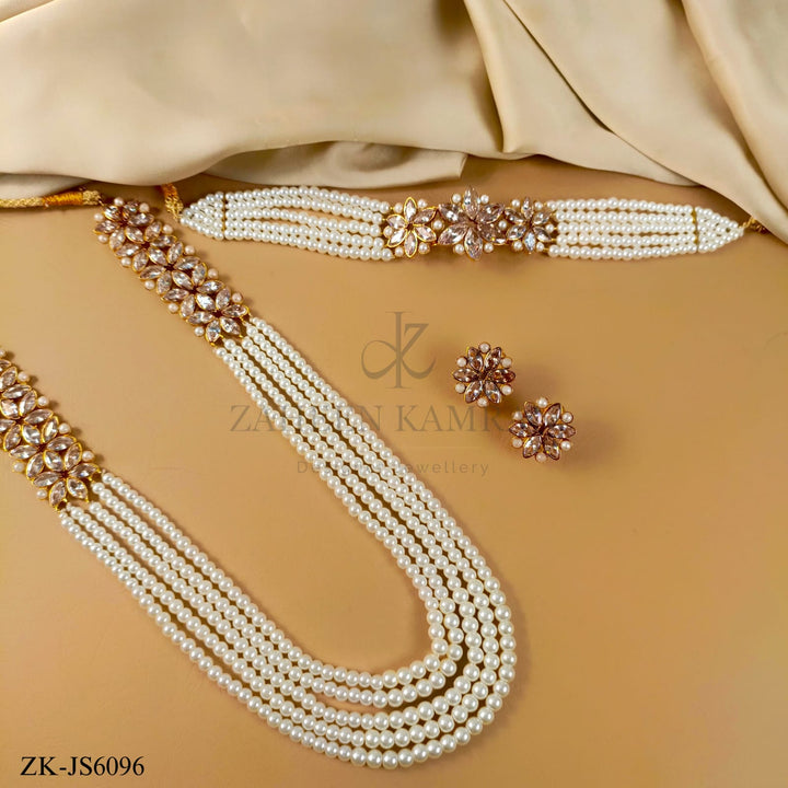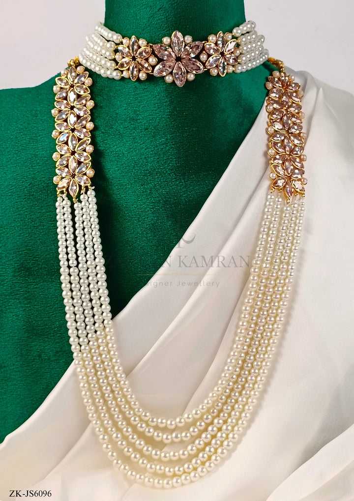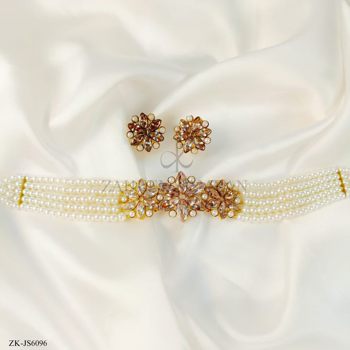 Handcrafted 22k gold plated choker, mala alongside earrings studded with champagne and pearls.