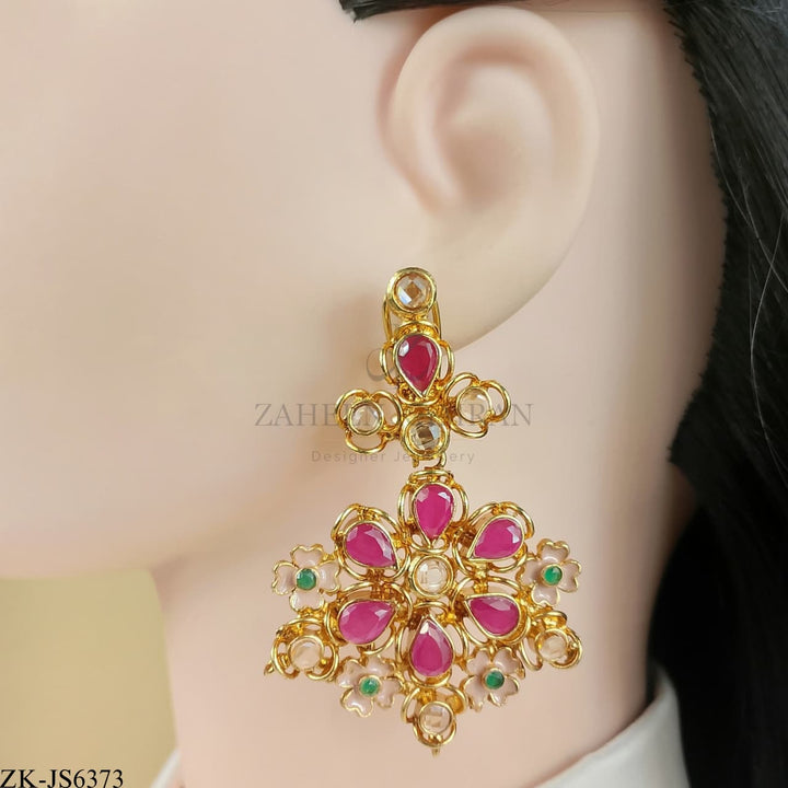 Handcrafted 22k gold plated necklace alongside earrings and tikka studded with pink zirconia, polki, emerald and pink Meena.