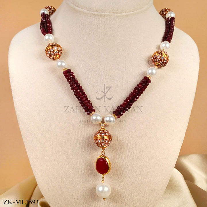 Handcrafted 22k gold plated mala studded with garnet, zircons and pearls.