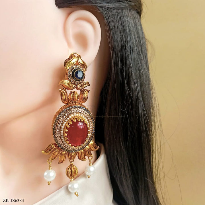 Handcrafted 22k gold plated mala alongside earrings studded with garnet, sapphire, zircons and pearls.