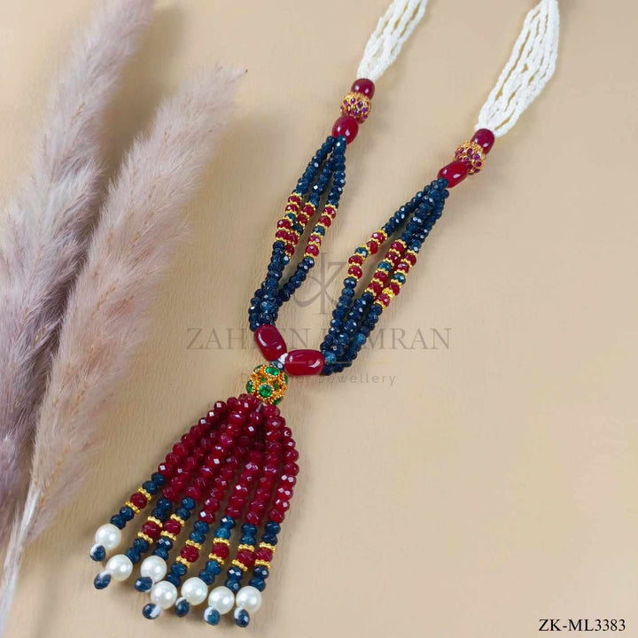Handcrafted 22k gold plated mala studded with garnet, sapphire and pearls.