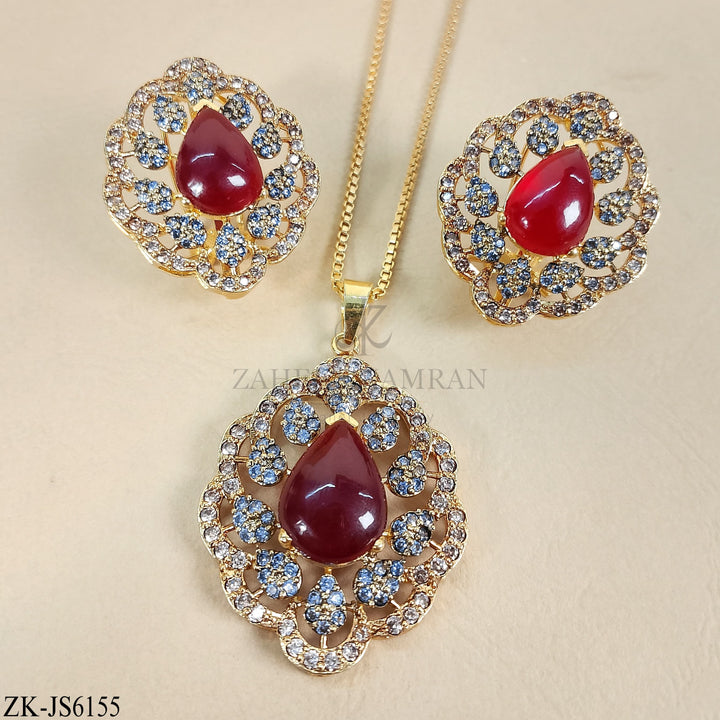 Handcrafted 22k gold plated pendant alongside earrings studded with garnet and Zircons.