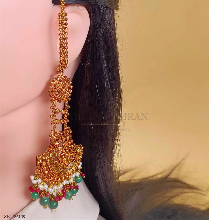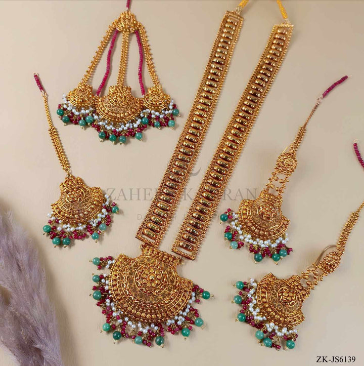 Handcrafted 22k gold plated mala alongside earrings, tikka and jhummar studded with ruby emerald and pearls