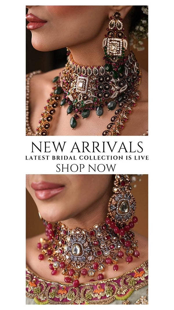 Handcrafted 22 k gold plated angla, handwoven with pearls and emeralds beads, studded with zircons Amethyst emeralds and handpainted with green meena