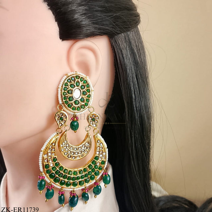 Handcrafted 22k gold plated earrings studded with kundan, emerald and pearls.