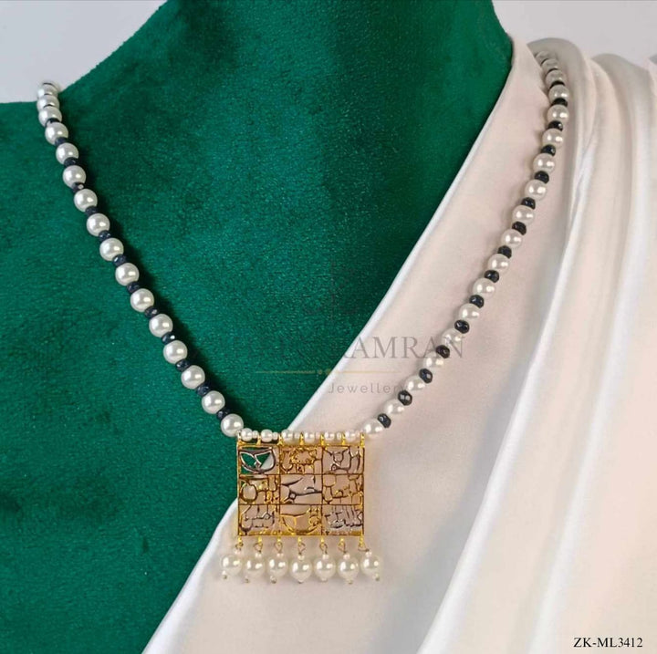 Handcrafted 22k gold plated mala studded with sapphire and pearls.