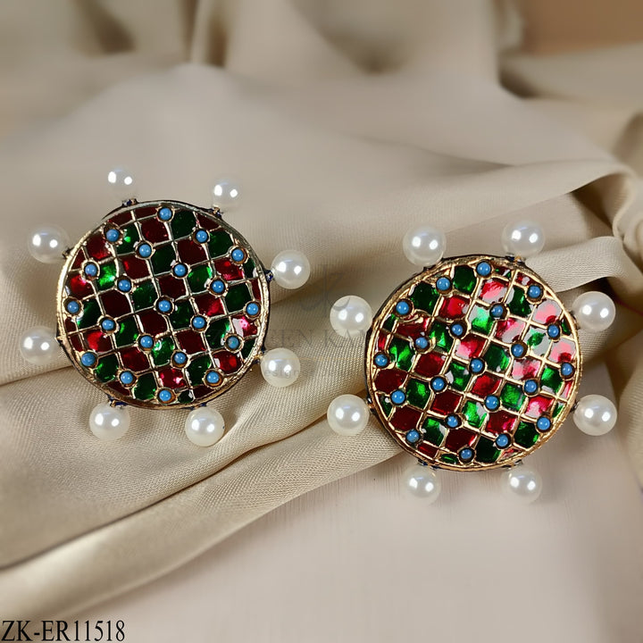 Handcrafted 22k gold plated earrings adorned with feroza, pearls, red and green meena.