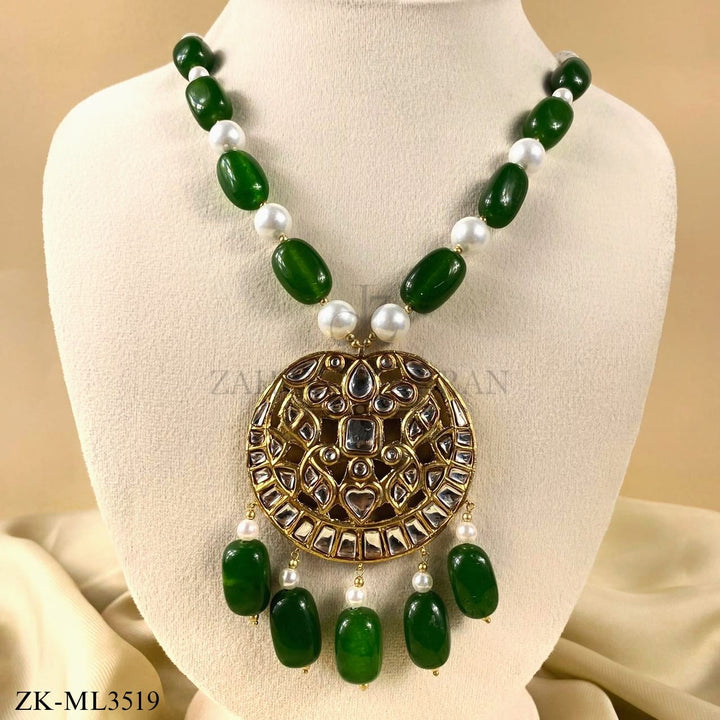 Handcrafted 22k gold plated mala studded with emerald, kundan and pearls.