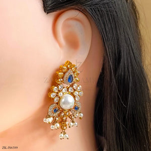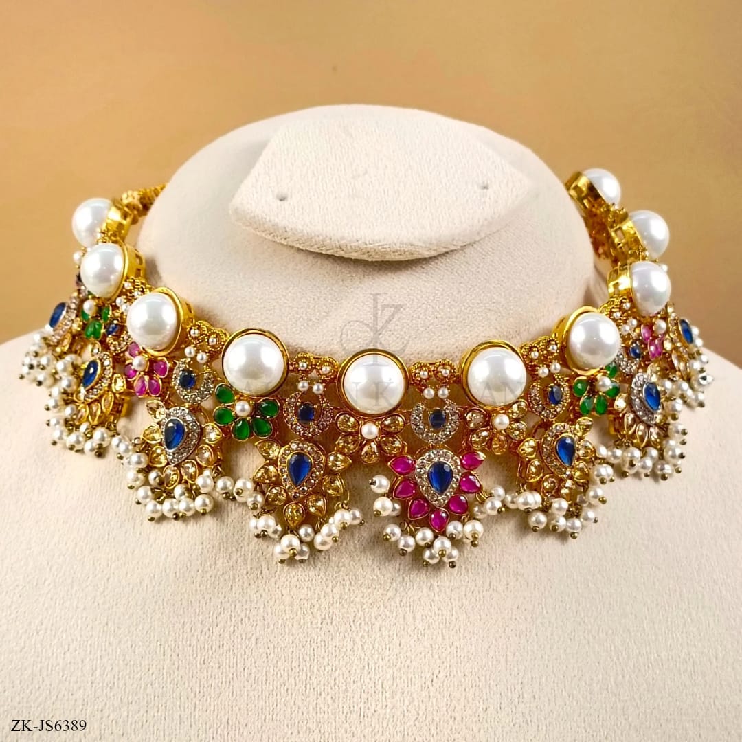 Handcrafted 22k gold plated necklace alongside earrings studded with multi stones.