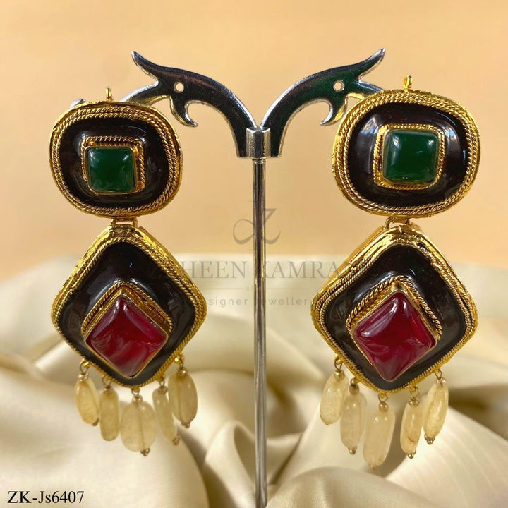 Handcrafted 22k gold plated necklace alongside earrings studded with multi stones.