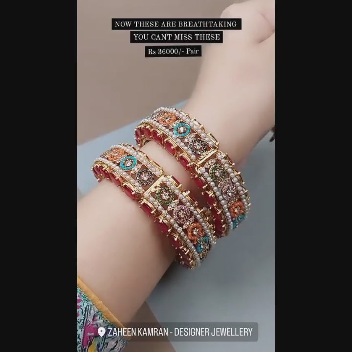 Handcrafted 22 k gold plated classic vintage Bangles studded with rubies, pearls, feroza beads orange beads, emeralds