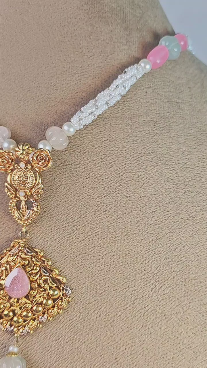 Handcrafted 22k gold plated mala studded with pink stones.