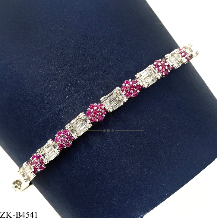 Handcrafted silver plated bangle studded with pink zirconia and cut stones.