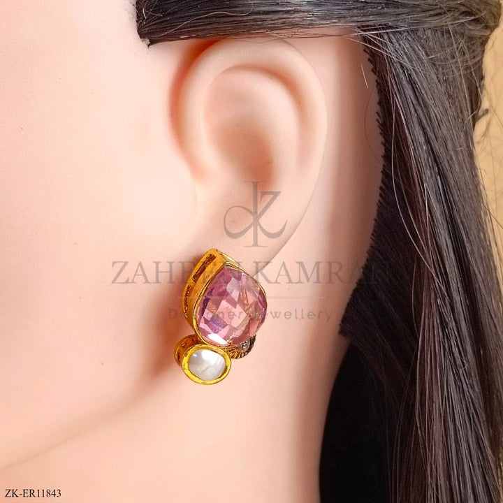 Handcrafted 22k gold plated earrings studded with white opal and pink zirconia.