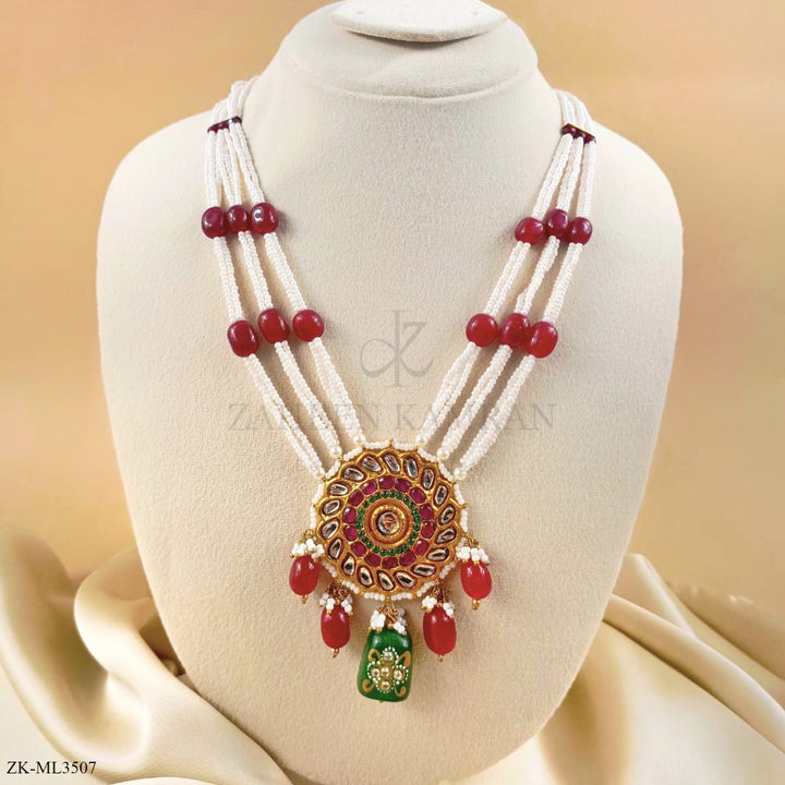 Handcrafted 22k gold plated mala studded with pink zirconia, emerald, kundan and pearls.