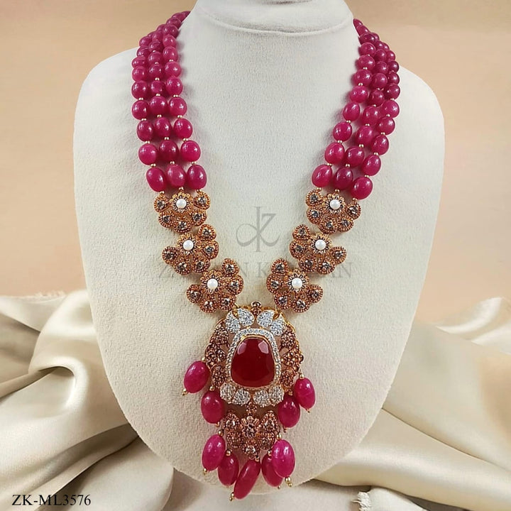 Handcrafted 22k gold plated mala studded with pink zirconia, pearls and zircons.