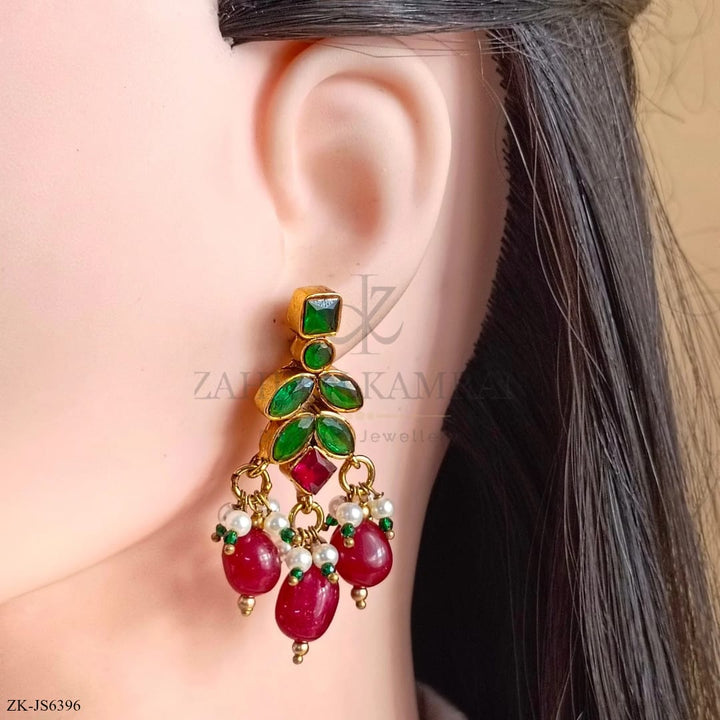 Handcrafted 22k gold plated mala alongside earrings studded with pink zirconia, emerald and pearls.