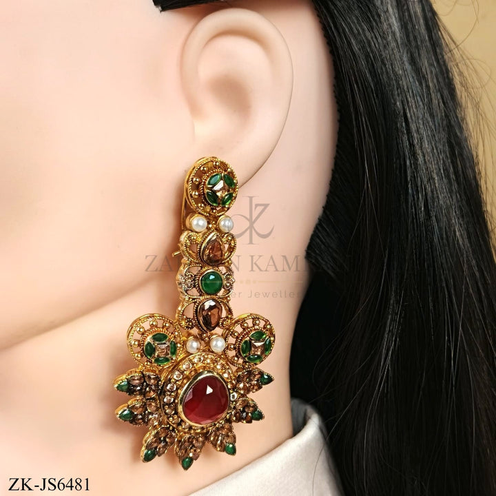 Handcrafted 22k gold plated necklace alongside earrings and tikka studded with pink zirconia, emerald and coffee stones.