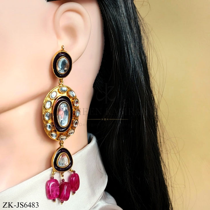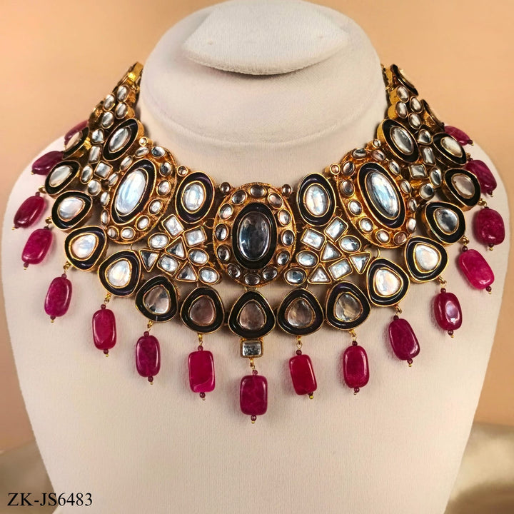 Handcrafted 22k gold plated necklace alongside earrings and tikka studded with pink zirconia, kundan and blue meena.