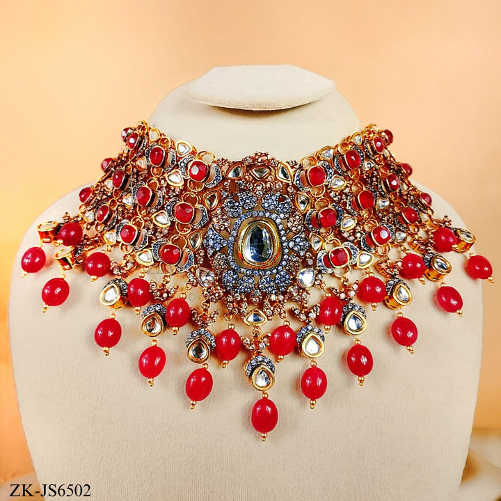 Handcrafted 22k gold plated necklace alongside earrings studded with pink zirconia, kundan and smoky stones.